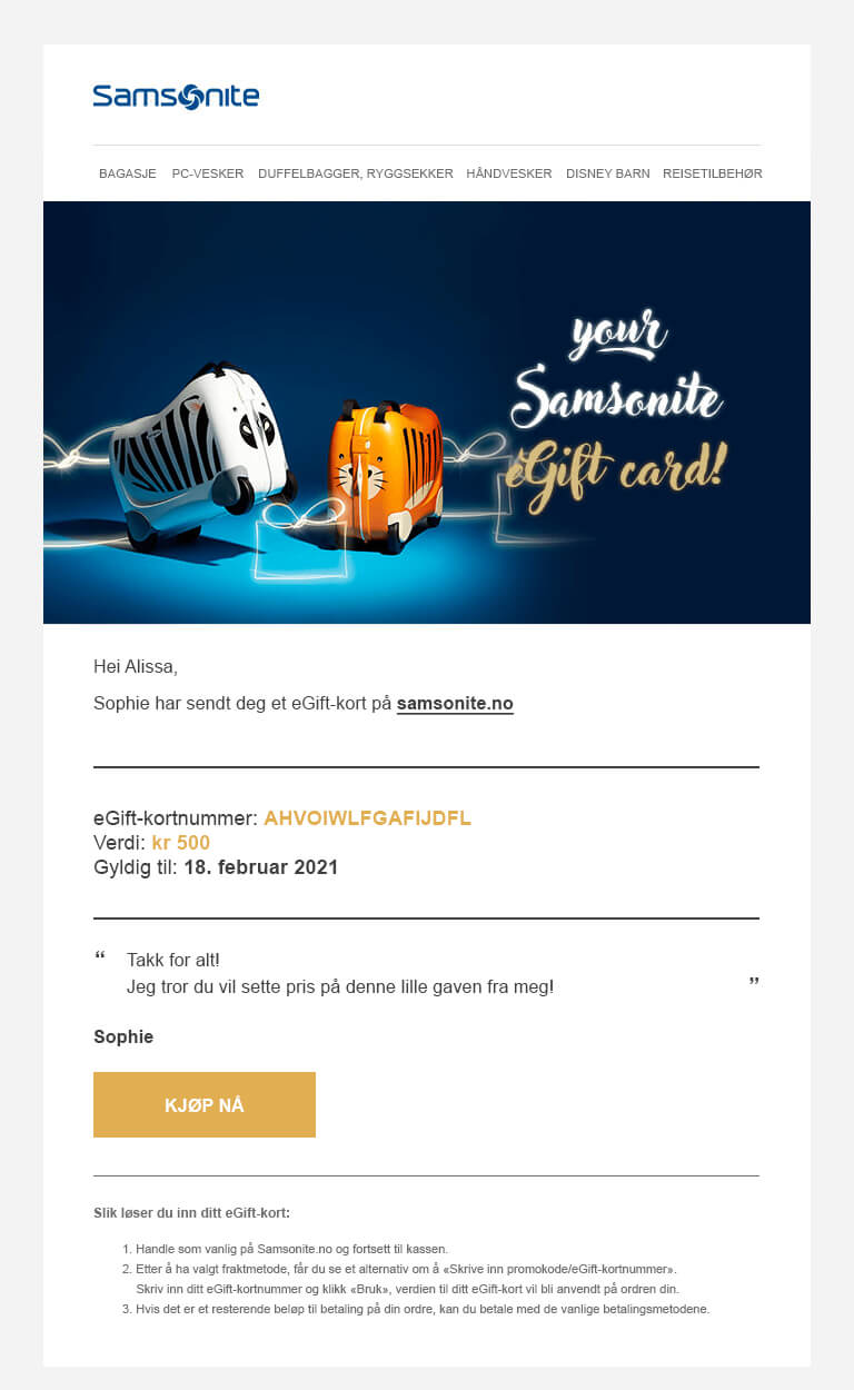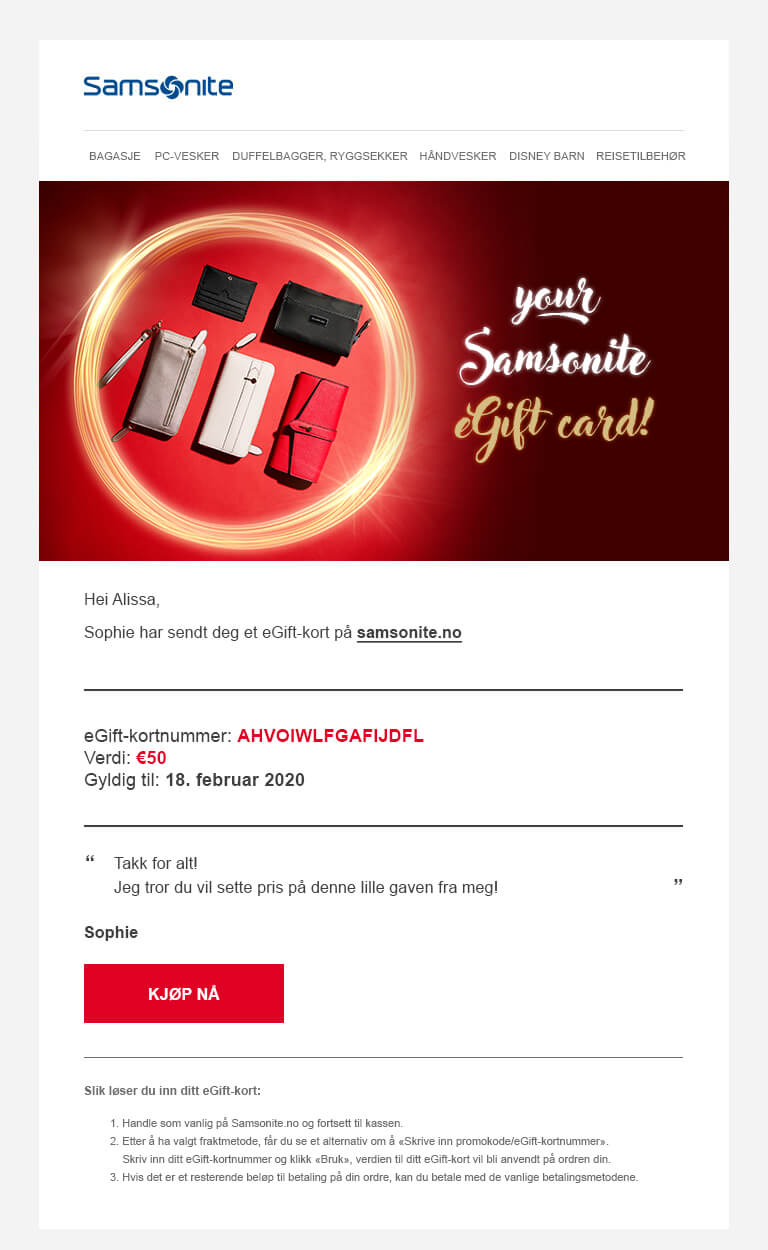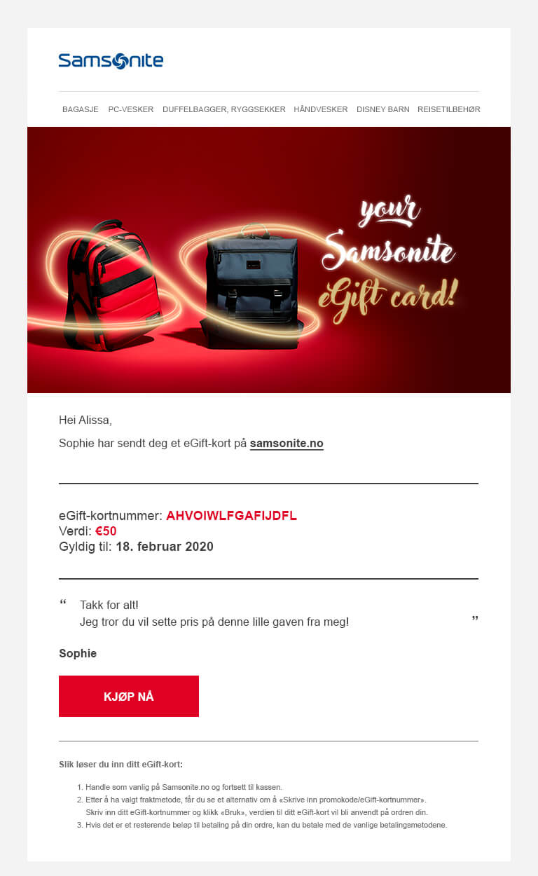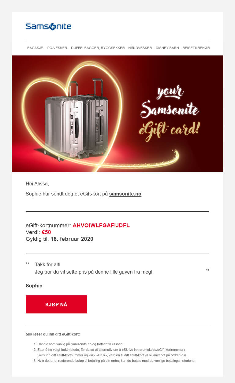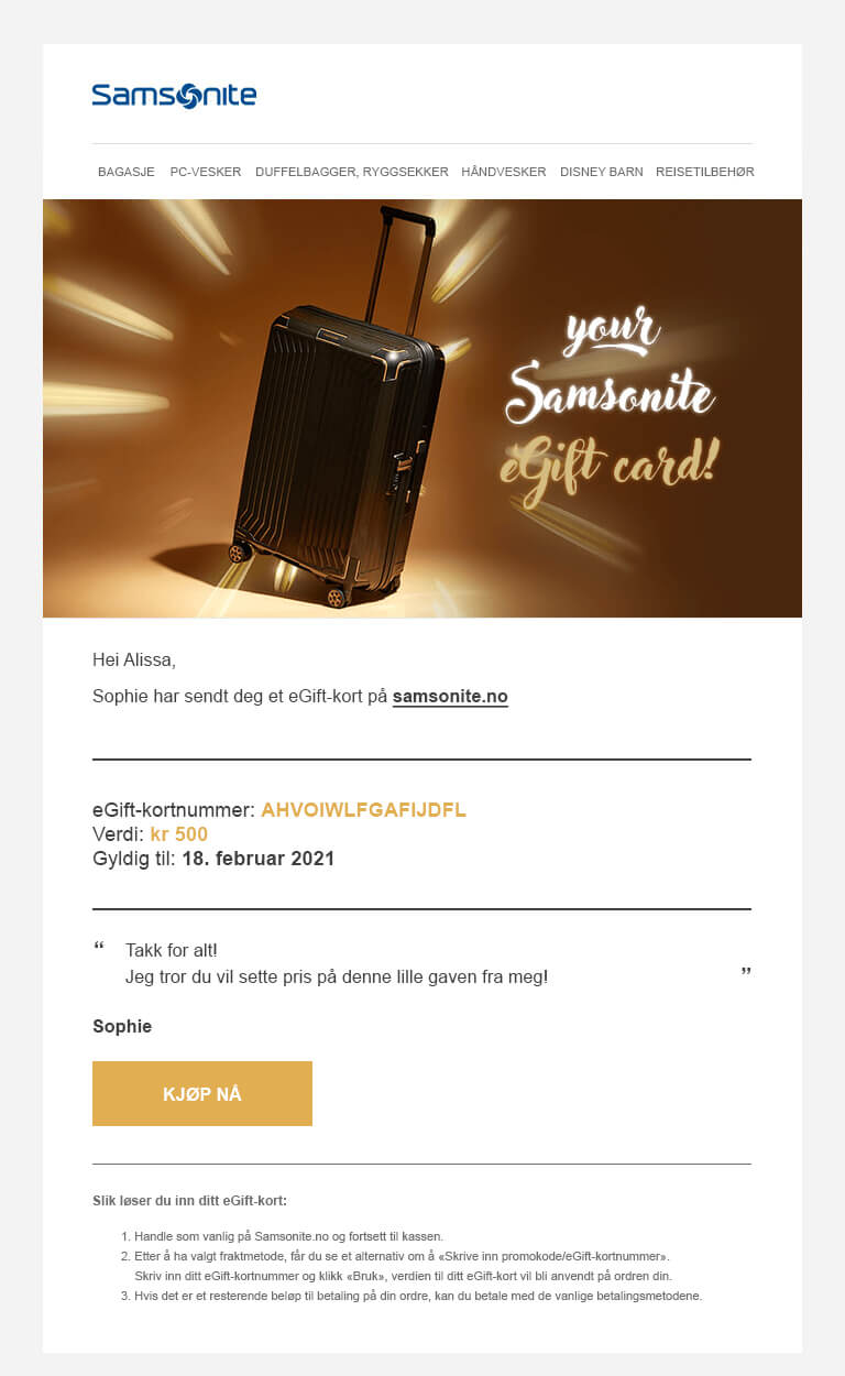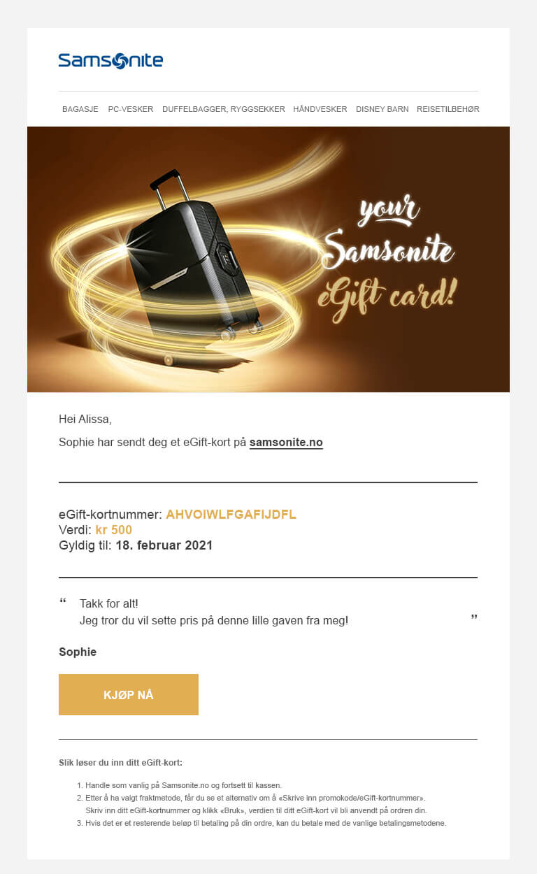 - Hvis du ønsker mer informasjon om eGift-kortet, kan du sende en e-post til customer.care@samsonite.com.